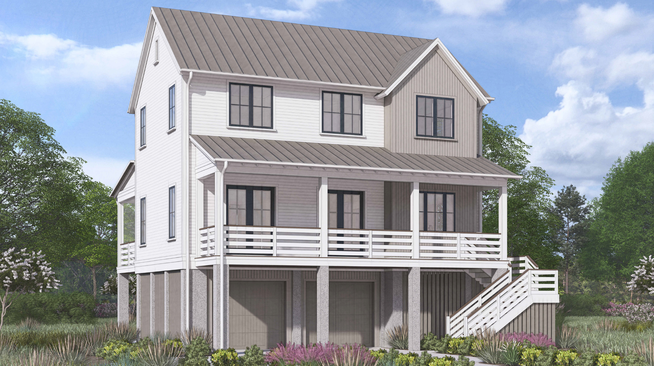 True to Lowcountry tradition, The Dune dedicates significant square footage to covered outdoor living. The broad front porch with its horizontal railing invites morning coffee and evening conversation, while the elevated design maximizes breezes and views.